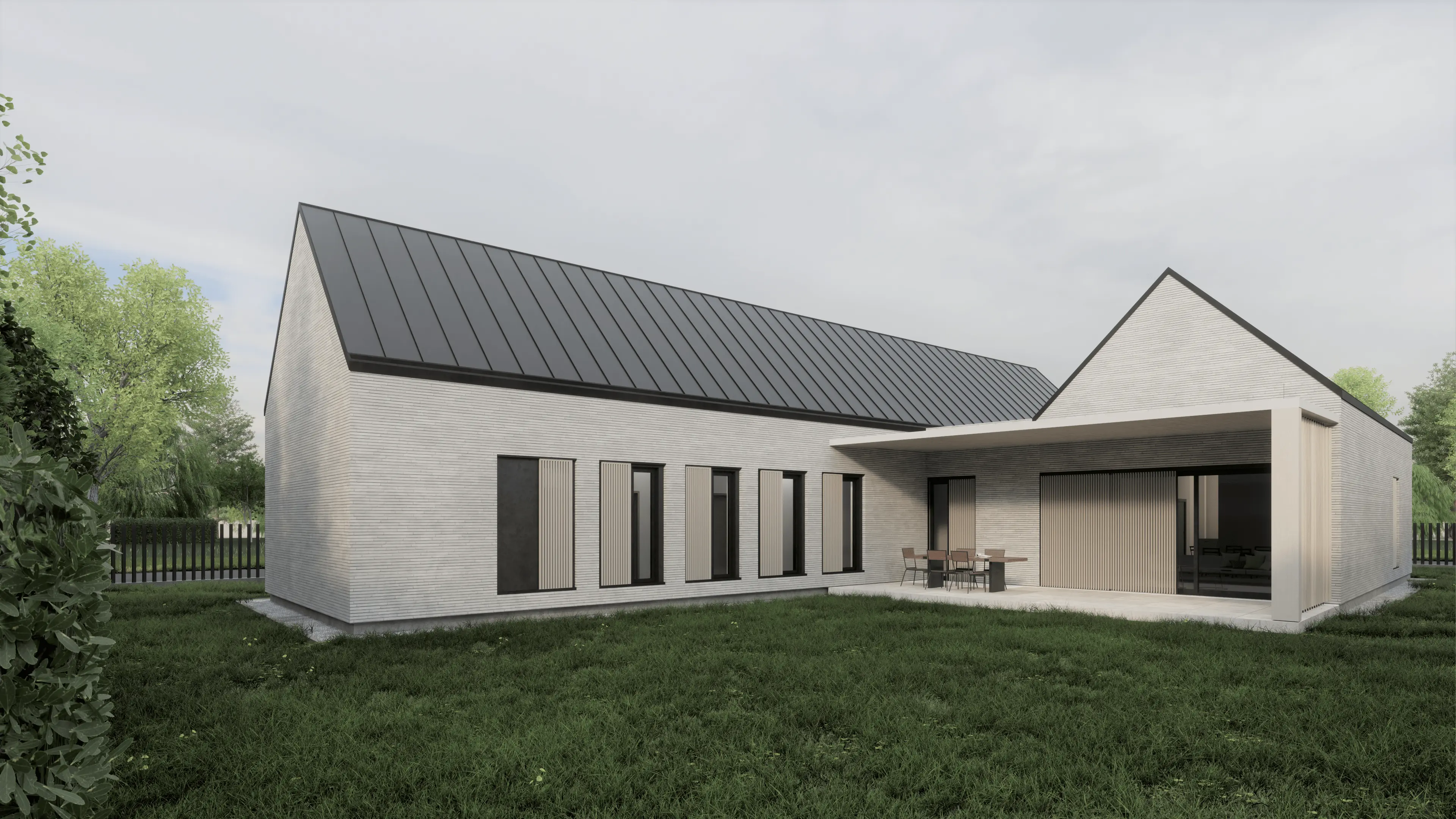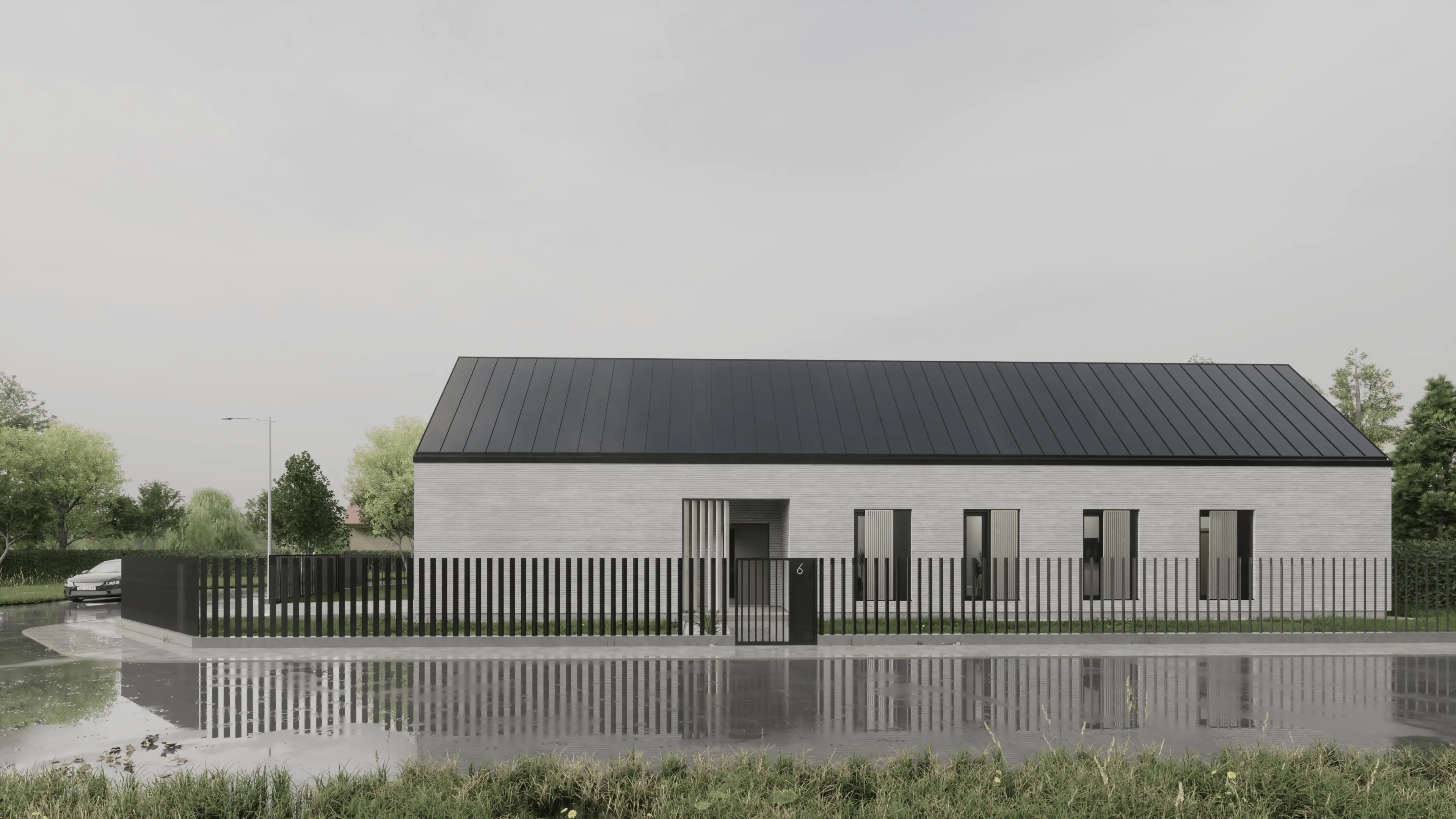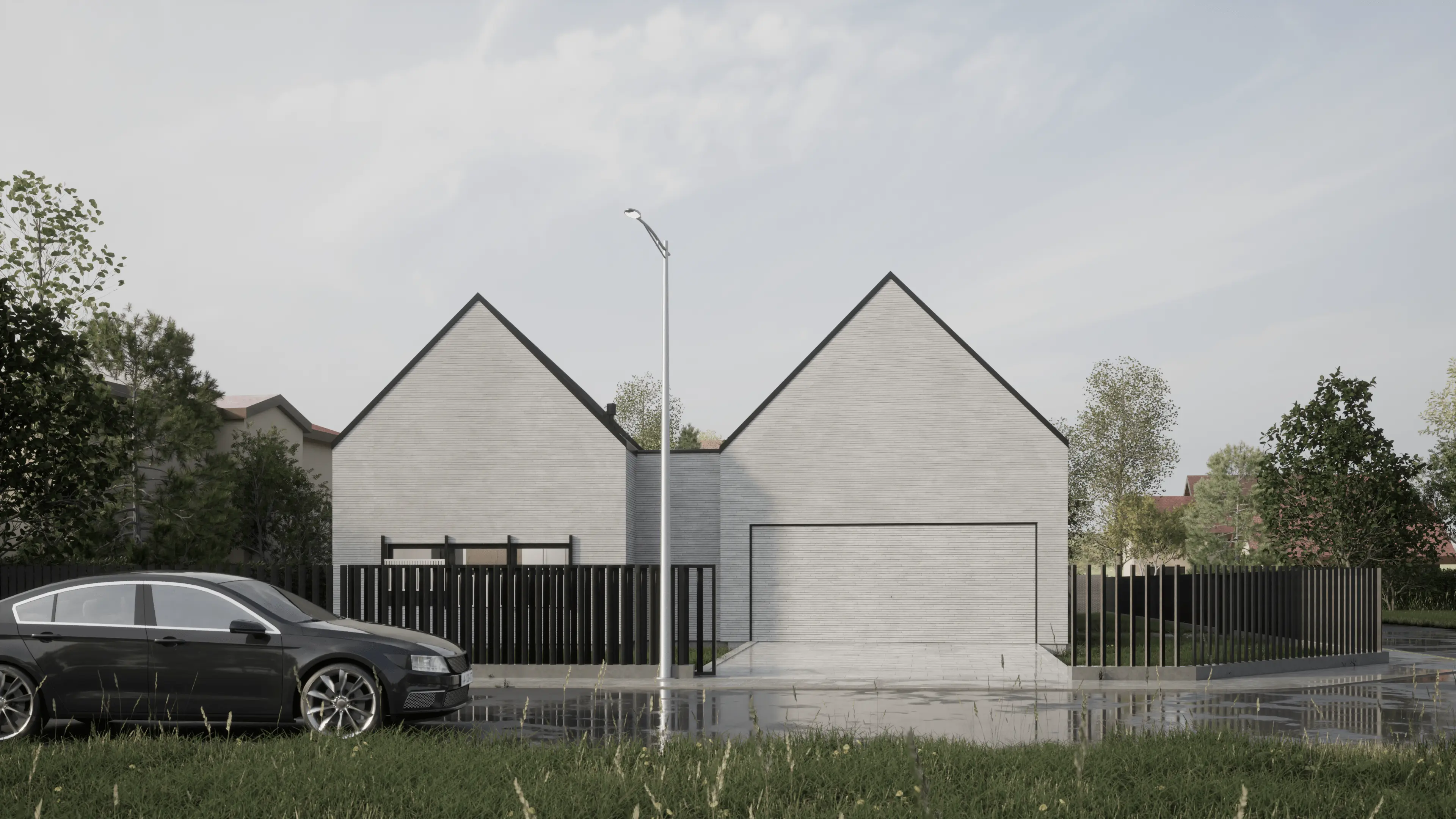 Parterowy budynek jednorodzinny, wykończony jednolitą okładziną elewacyjną - betonowymi płytkami elewacyjnymi w kolorze białym. Dach w kolorze czarnym pozwala na łatwe ukrycie wizualne paneli fotowoltaicznych. Płaskie zadaszenie tarasu, z surowego betonu architektonicznego, zostało do boku dopełnione ażurowym przepierzeniem z thermo jesionu. Okiennice wykonane z pionowych elementów stalowych malowanych na kolor elewacji, dzięki odpowiedniemu zmniejszeniu grubości izolacji termicznej, po rozłożeniu licują się z elewacją.