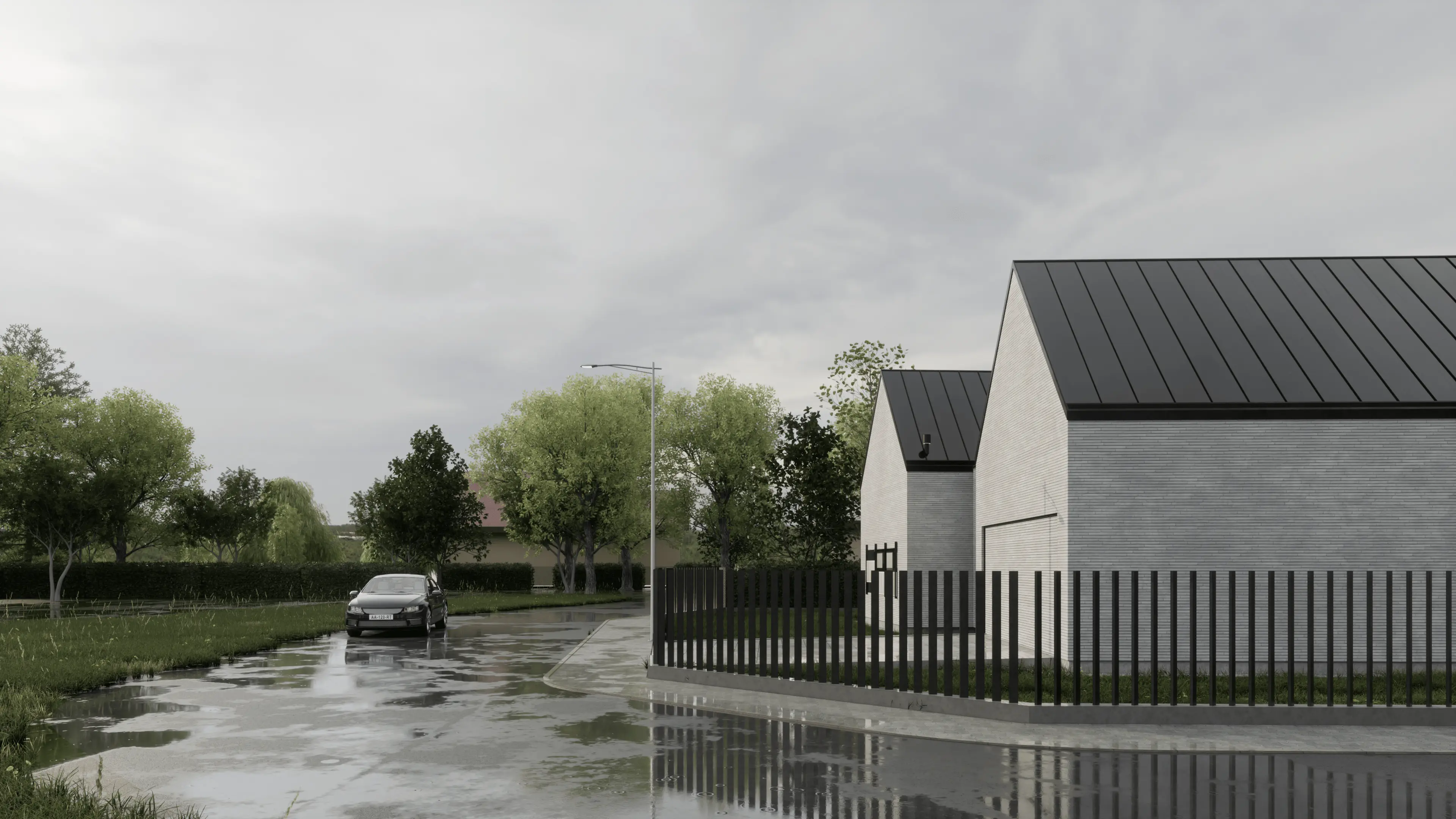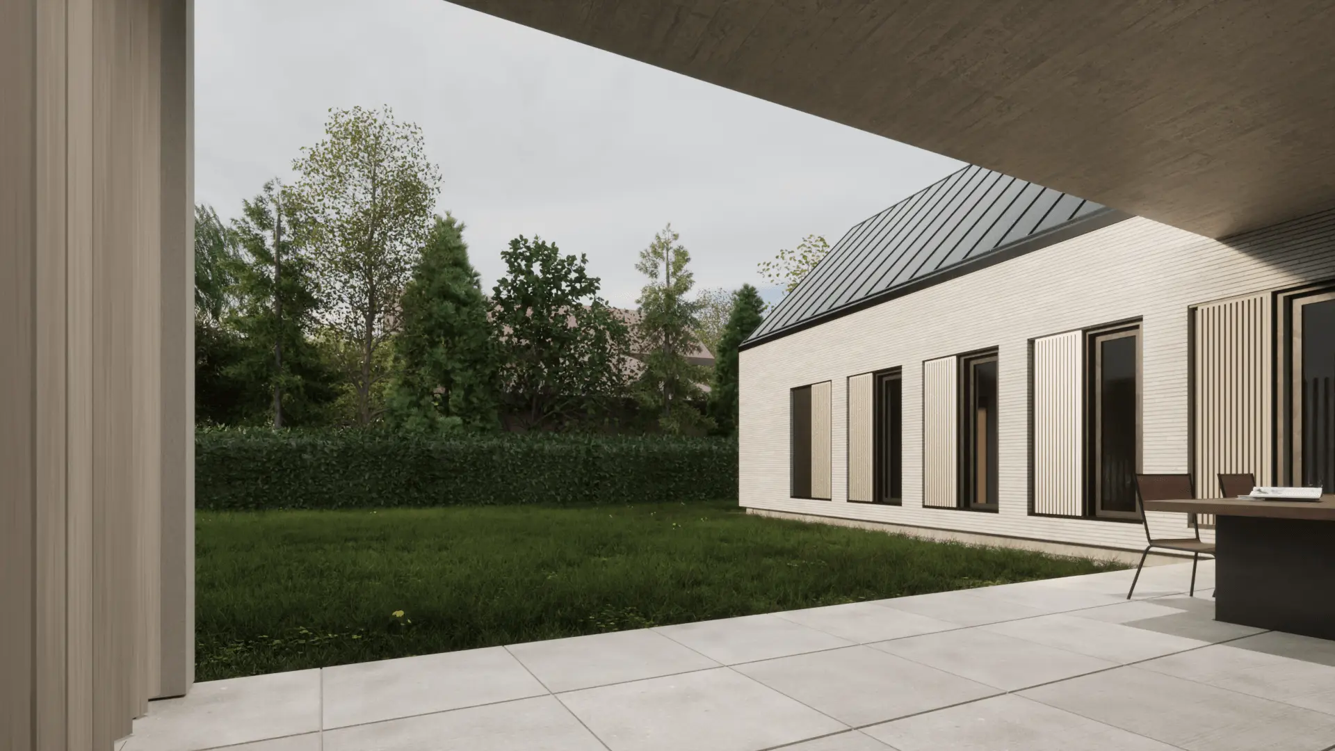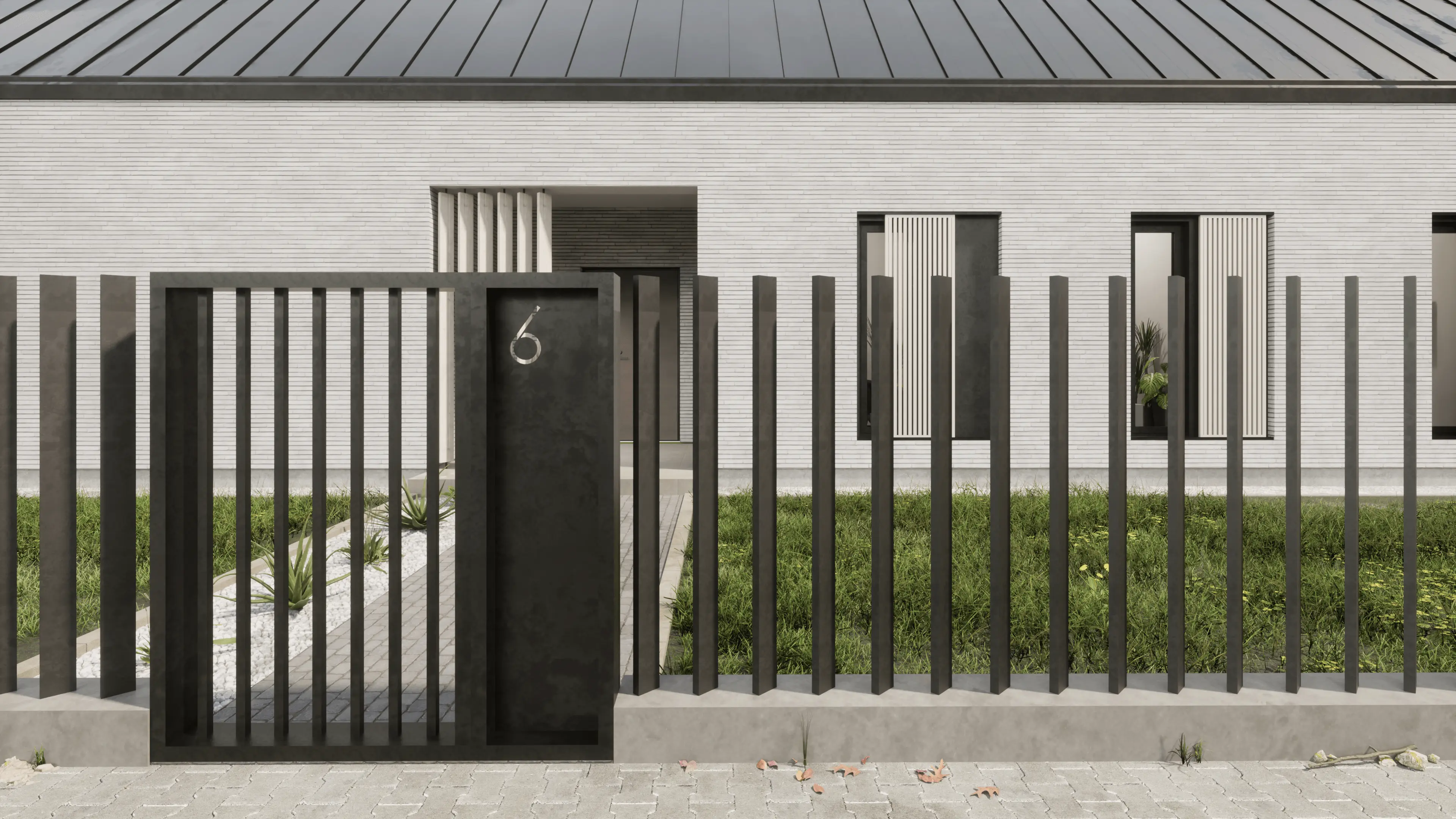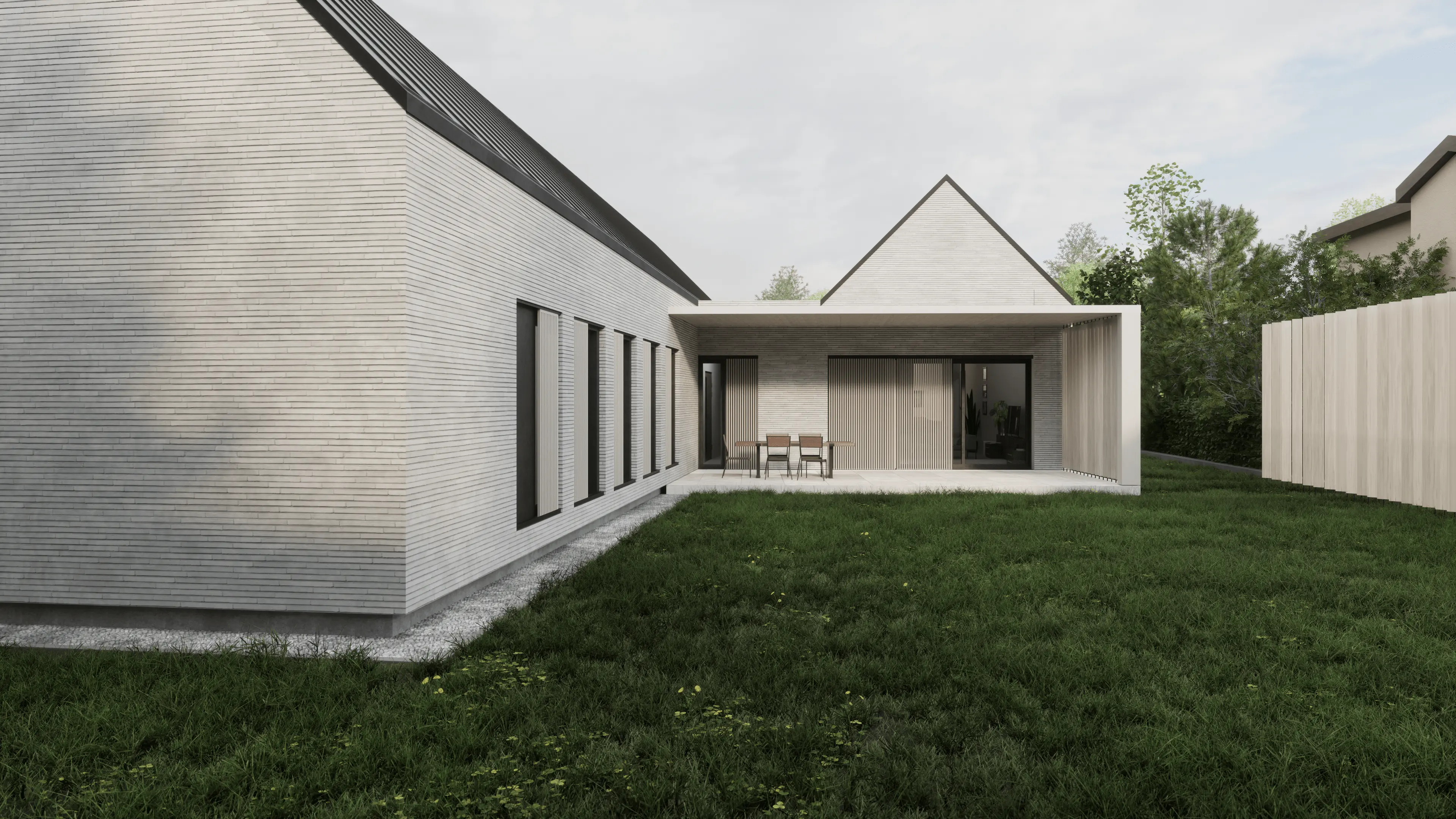 Parterowy budynek jednorodzinny, wykończony jednolitą okładziną elewacyjną - betonowymi płytkami elewacyjnymi w kolorze białym. Dach w kolorze czarnym pozwala na łatwe ukrycie wizualne paneli fotowoltaicznych. Płaskie zadaszenie tarasu, z surowego betonu architektonicznego, zostało do boku dopełnione ażurowym przepierzeniem z thermo jesionu. Okiennice wykonane z pionowych elementów stalowych malowanych na kolor elewacji, dzięki odpowiedniemu zmniejszeniu grubości izolacji termicznej, po rozłożeniu licują się z elewacją.